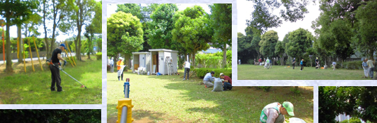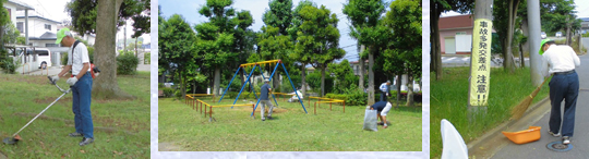 萱橋公園では、はびこる雑草を草刈り機でカットし、それを熊手で掻き集めてゴミ袋に詰め込むという作業が続きました。