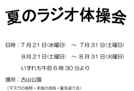 時 間:朝6時30分から(NHKラジオ放送に合わせて ラジオ体操第1・第2)