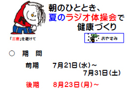 対 象:ちびっ子 ご町内のみなさま「朝のラジオ体操」は、夏休み初日にスタートします。